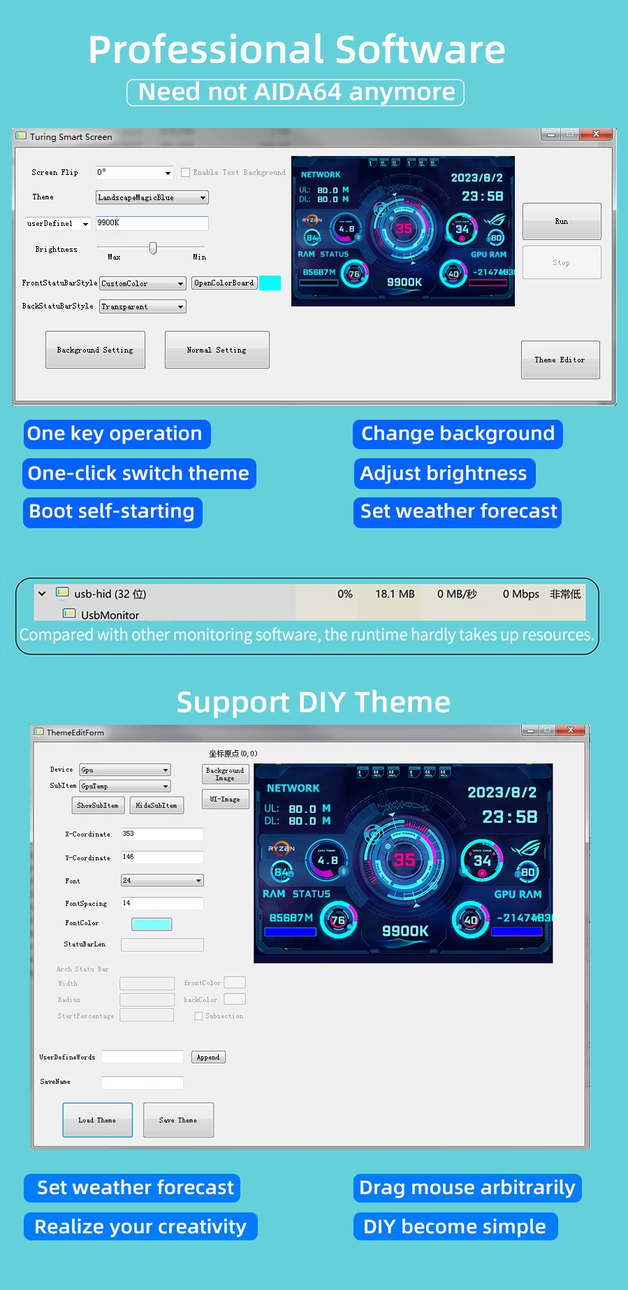 IPS Tipo C Tela Secundária para Computador, CPU, GPU, RAM, Display HDD, 320x480